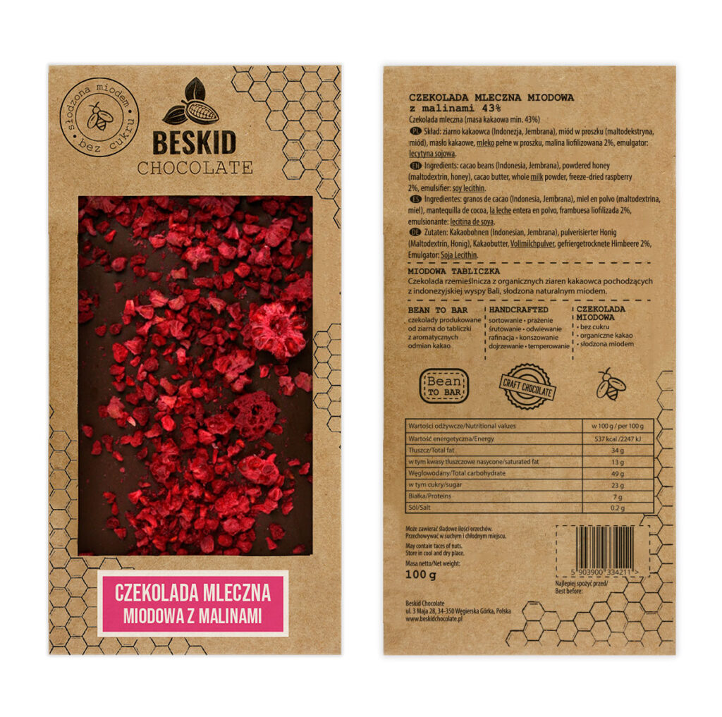 Skład: ziarno kakaowca (Indonezja Bali Jembrana organic), mleko pełne w proszku, miód, masło kakaowe, liofilizowana malina 2%, emulgator: lecytyna sojowa