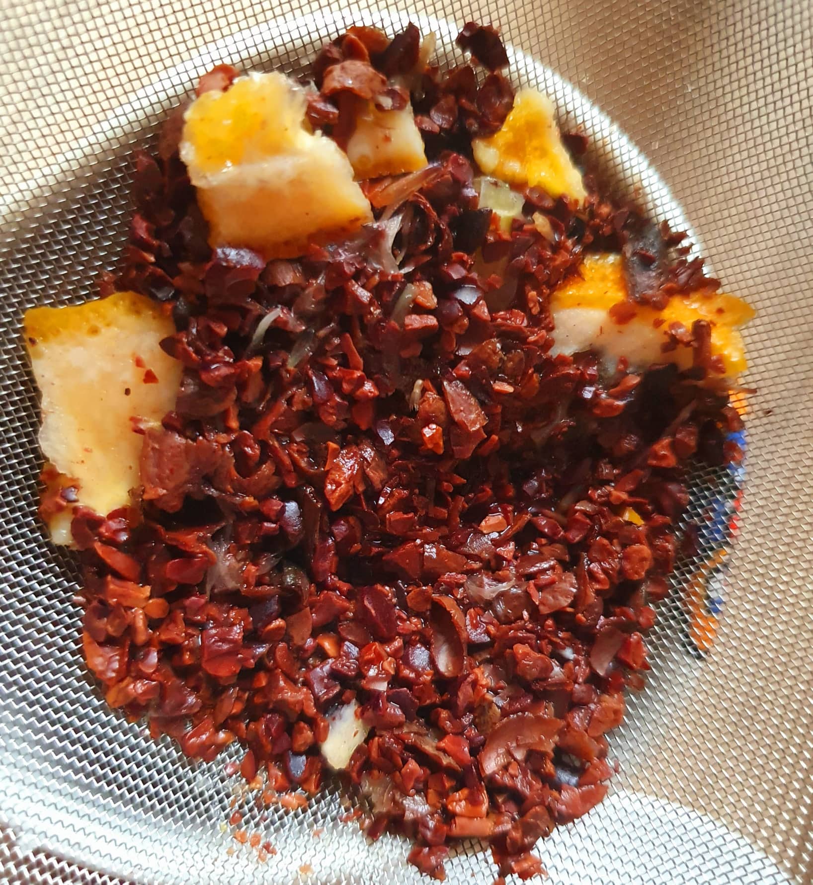 Po zaparzeniu odcedzam drobinki kakao, pomarańczy i bławatka przez sitko.