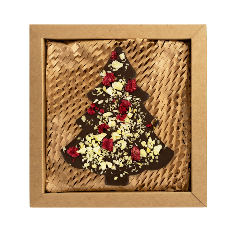 Czekolada mleczna w formie choinki zapakowana w eleganckie pudełko z okienkiem.