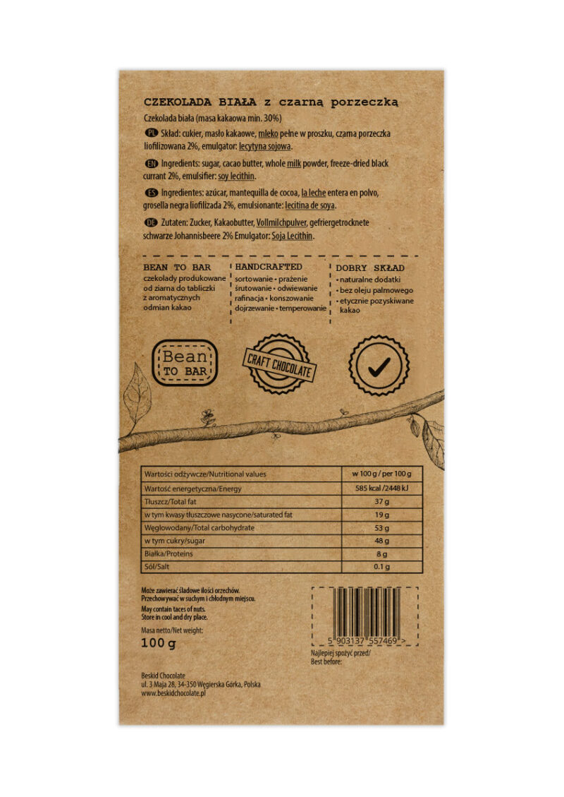 Wyjątkowa tabliczka białej czekolady, przełamana delikatną kwasowością czarnej porzeczki i specyficzną goryczką w posmaku. Połączenie doskonałe które uruchamia każdy możliwy smak podczas delektowania się czekoladą.