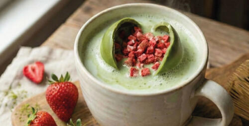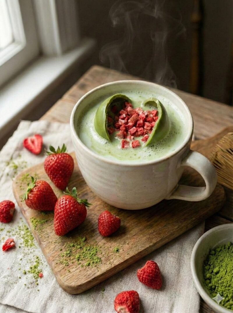 Czekoladowa Bomba z białej czekolady z matchą i liofilizowanymi truskawkami — wyjątkowa nowość, w której kremowa, słodka biała czekolada łączy się z lekko gorzką matchą i intensywnie owocowymi truskawkami. Zalej gorącym mlekiem i delektuj się aromatycznym, unikalnym napojem! 🍓🍫🌿