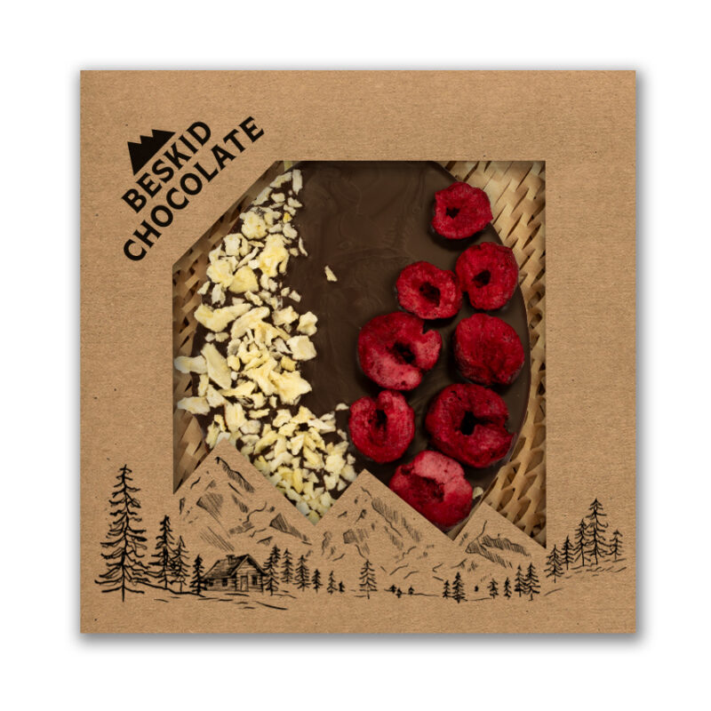 Rzemieślnicze czekoladowe jajko wielkanocne z czekolady gorzkiej 72% kakao z dodatkiem liofilizowanej wiśni i pomarańczy. Intensywny, wytrawny profil kakao łączy się tu z naturalną owocową świeżością – soczystą kwasowością wiśni i cytrusową nutą pomarańczy.