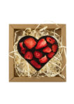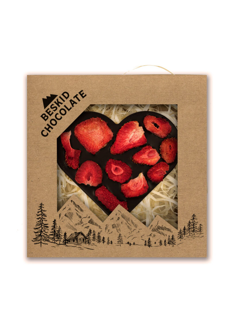 Serce z czekolady ciemnej 72 % z dodatkiem truskawek. Czekoladowe serce zapakowane jest w estetyczne pudełko z kartonu typu kraft wypełnione „eko wiórkami”.