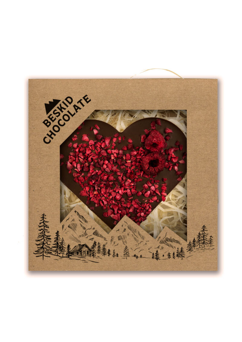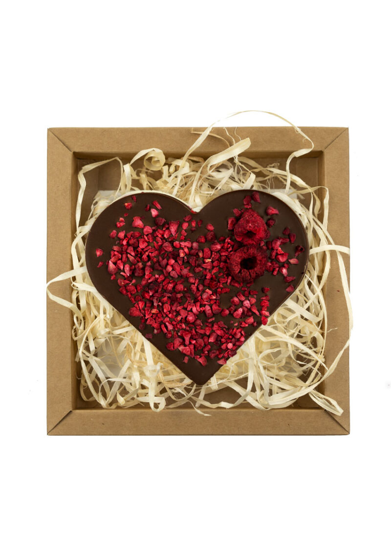 Serce z czekolady mlecznej z dodatkiem malin liofilizowanych. Pakowane w estetyczne pudełko z kartonu kraft wypełnione „eko wiórkami”.