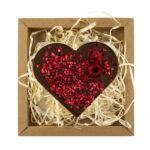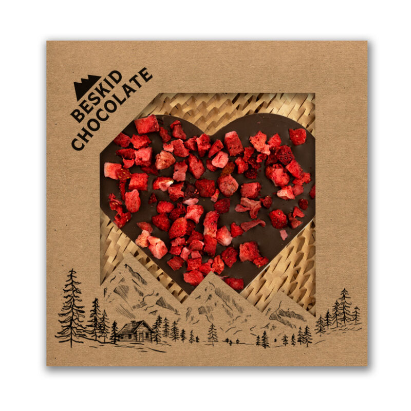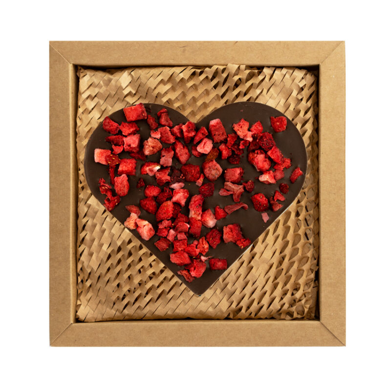 Serce z  czekolady mlecznej  z dodatkiem truskawek liofilizowanych. Pakowane w estetyczne pudełko z kartonu kraft wypełnione „eko wiórkami”.